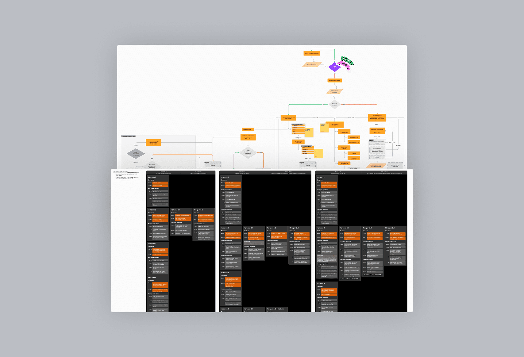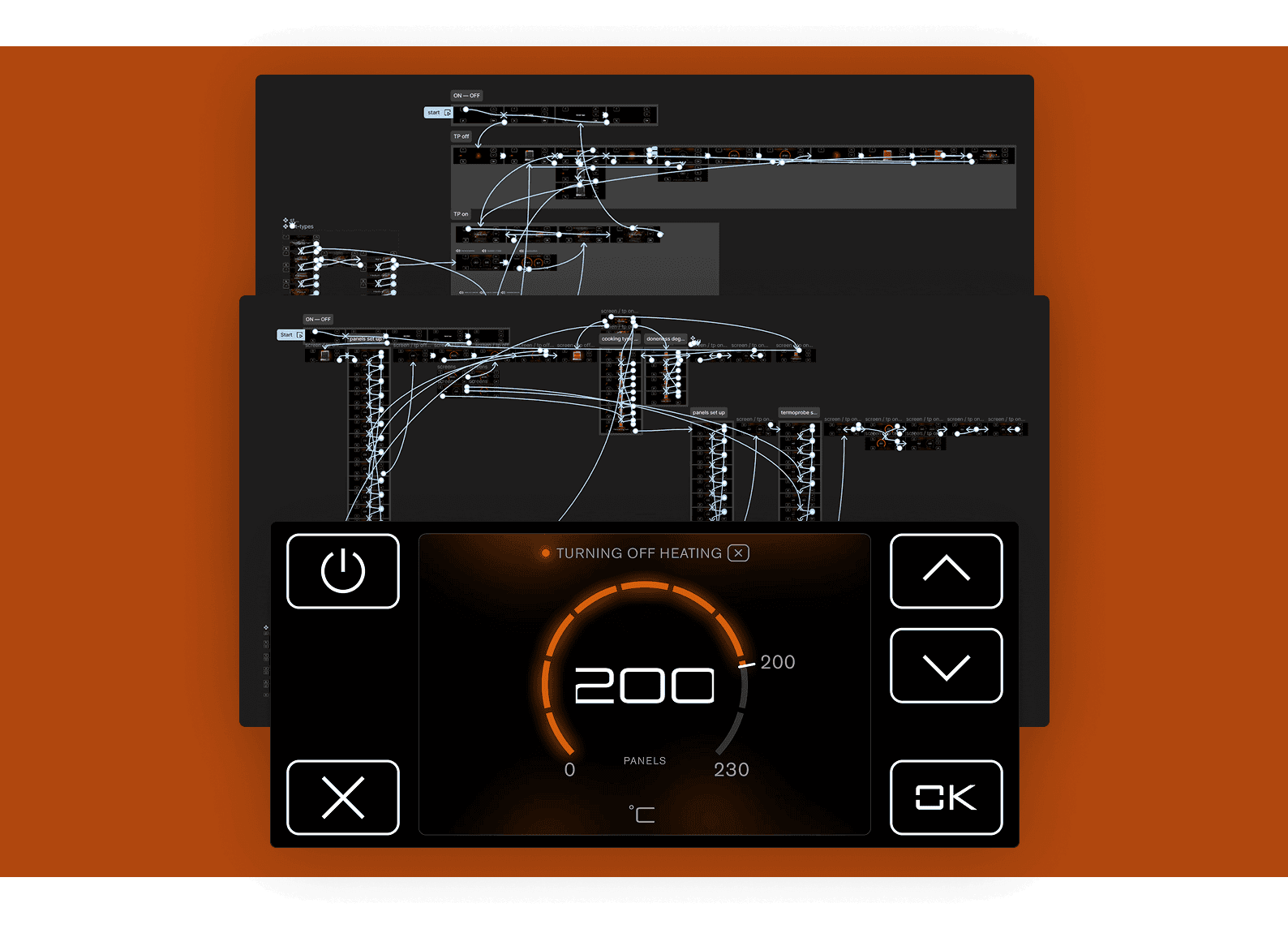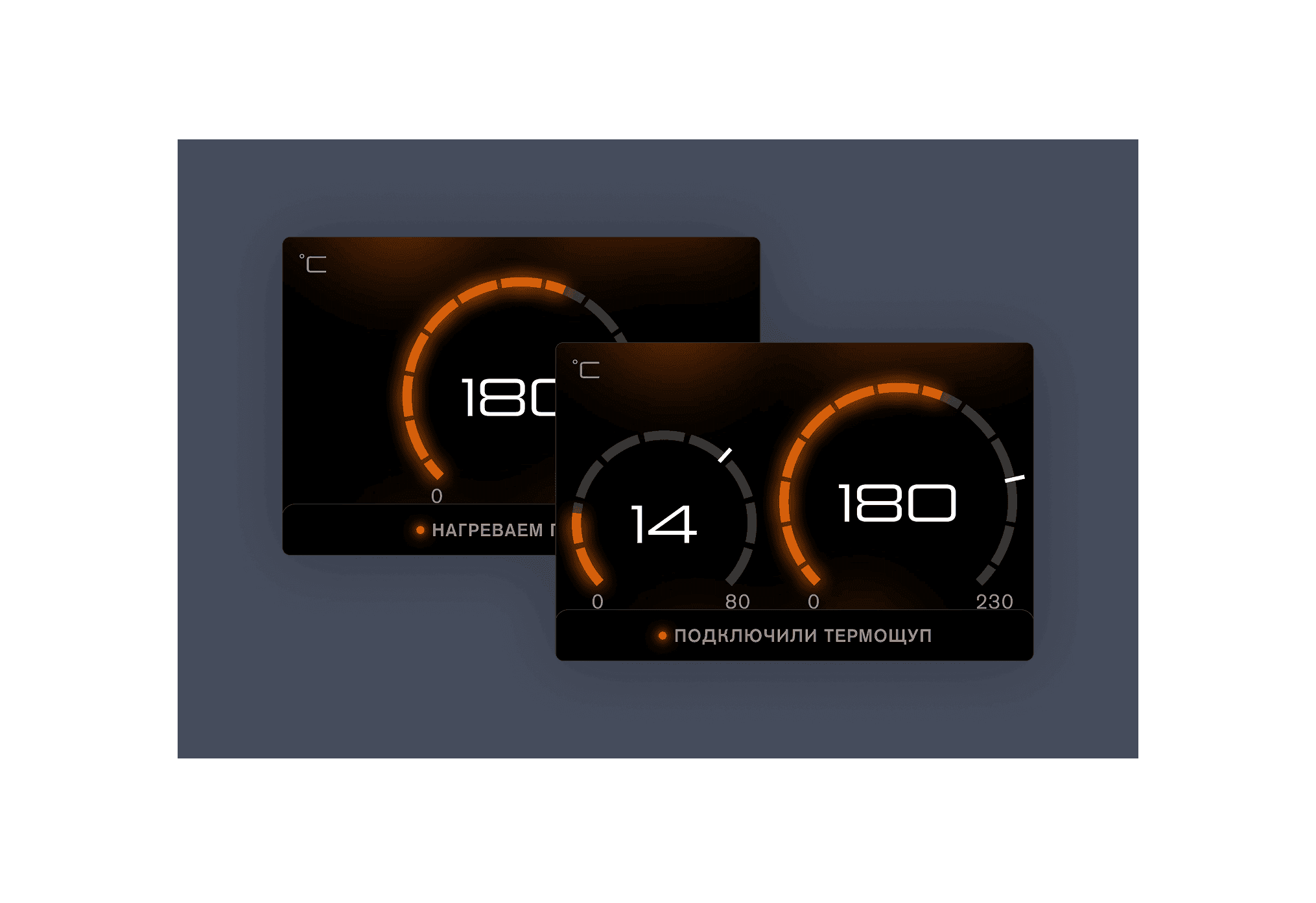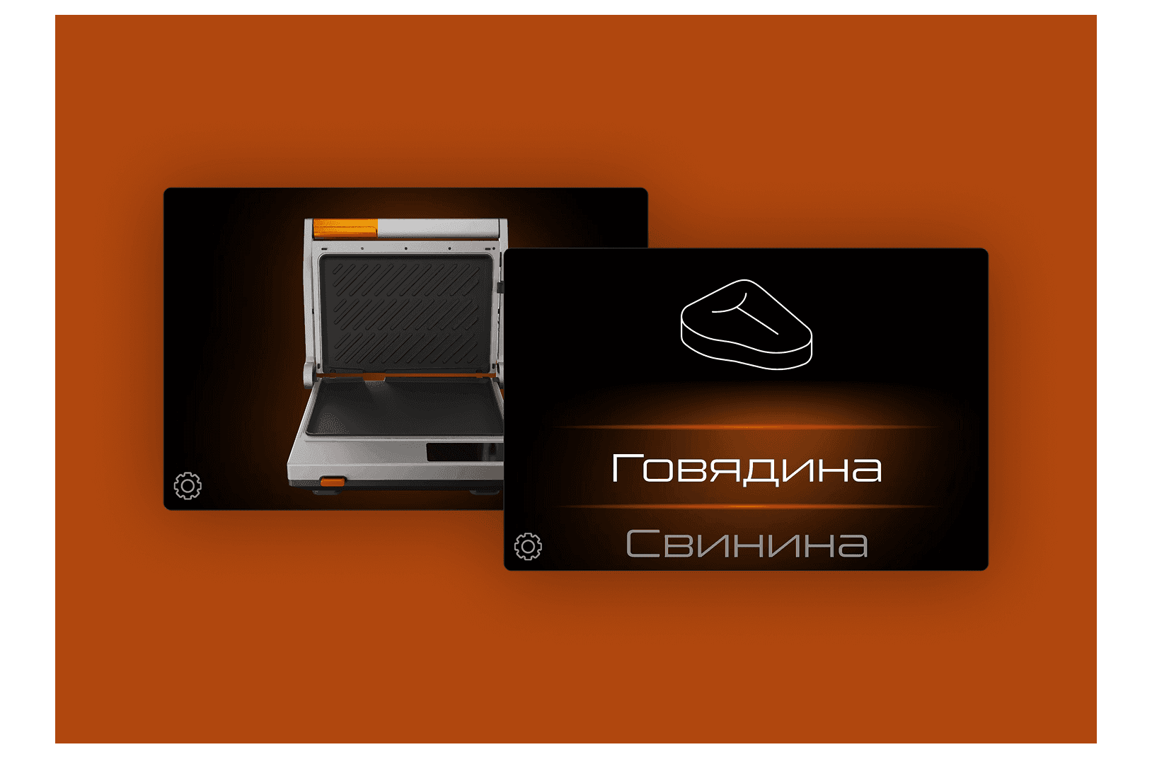 Был запрос на понятный, удобный и выдержанный в духе бренда дизайн хардверной и софтверной частей нового электрогриля. Нужно было определить количество, расположение и формат кнопок управления, расписать кейсы взаимодействия повара с грилем, сделать приятные интерфейсные анимации, которые помогают в работе с грилем, но не отвлекают от важного. Одним из вызовов было размещение большого количества графики и анимаций на железе с достаточно слабыми характеристиками и малым объёмом памяти (16 МБ).