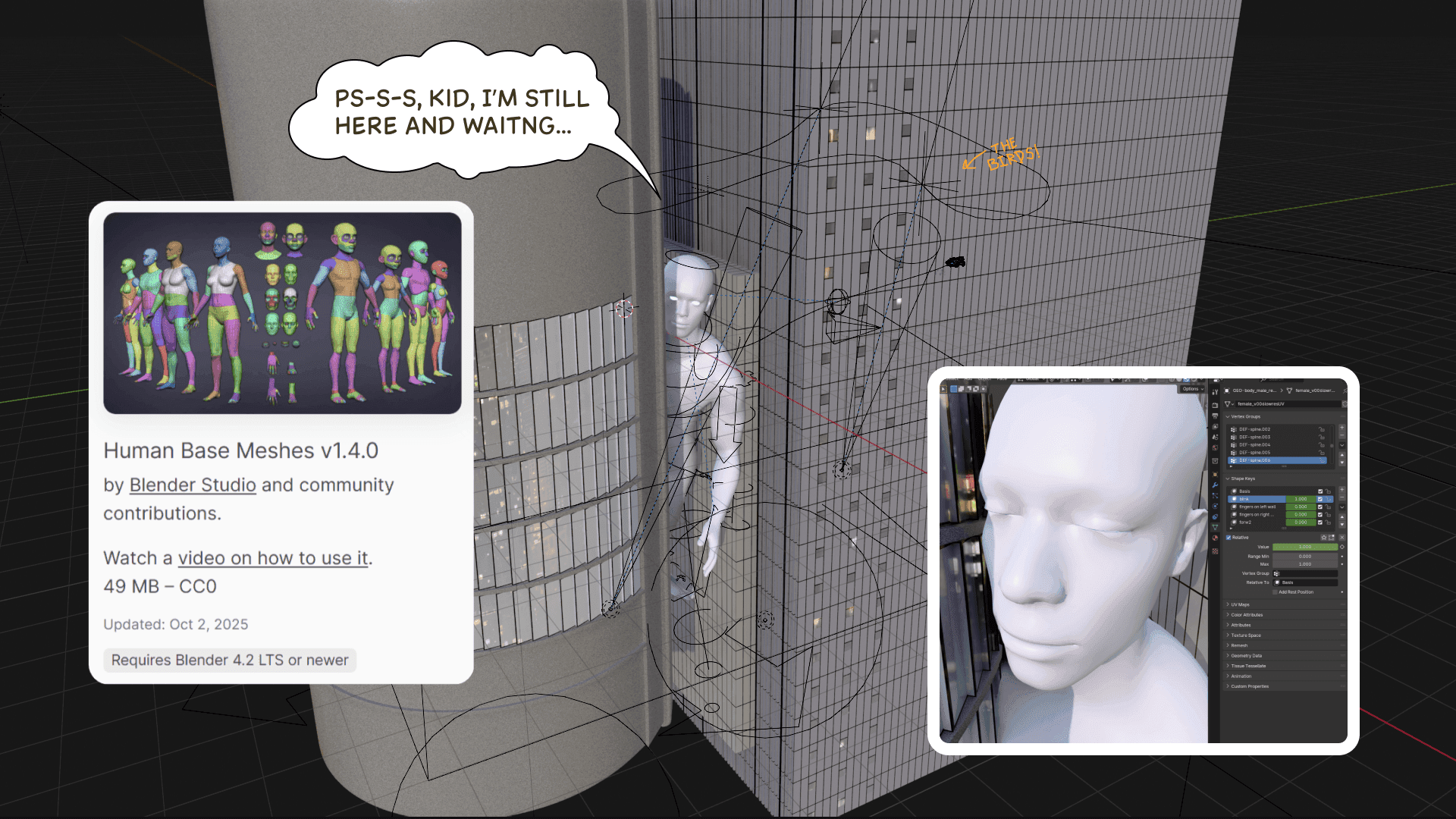 Для колосса использовал готовый ассет, а всё остальное моделил и текстурил самостоятельно с помощью бесплатных ресурсов. В том же Blender потом сделал финальный монтаж с добавлением звуковых эффектов, и получил 24 секунды гигантофобии.